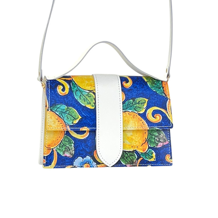 Δερμάτινη τσάντα με χερούλι, ρυθμιζόμενο λουράκι ώμου με 2 αγκράφες, υποδοχή για να περαστεί σε ζώνη και εκτύπωση στον κορμό της. Διαστάσεις 20x14x5 εκ.