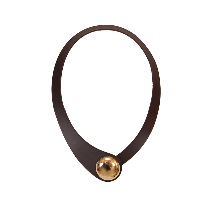 Δερμάτινοι κύκλοι σε διάφορα μεγέθη κρέμονται από αλυσίδα σε ένα αρμονικό σύνολο σχηματίζοντας ένα μακρύ κολιέ με βραδινό κυρίως ύφος.