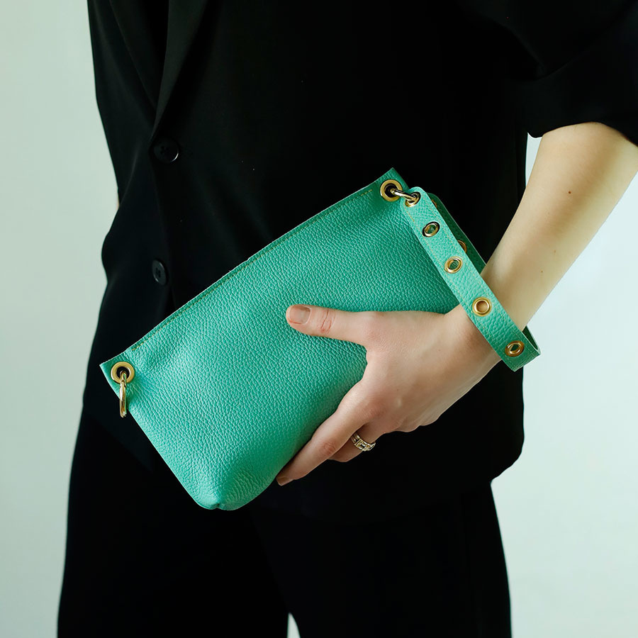 Δερμάτινο τσαντάκι από μαλακό δέρμα, με λουράκι χεριού διακοσμημένο με τρουκς.