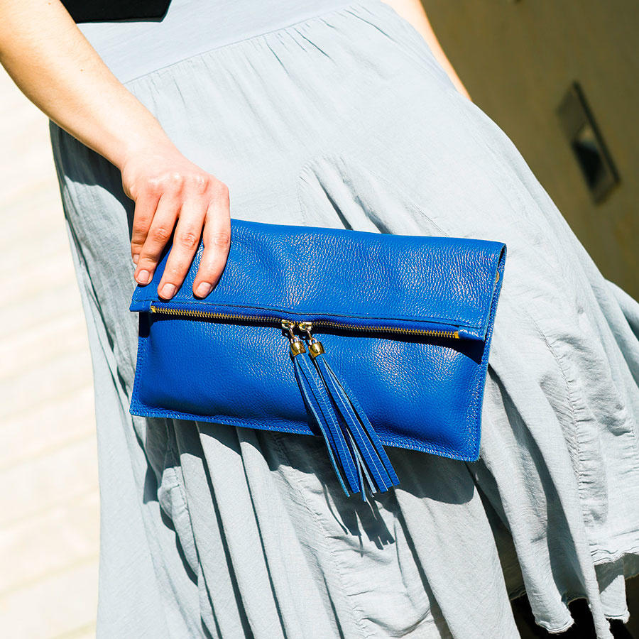 Δερματινος φάκελος που κλείνει με φερμουάρ και κρέμονται φουντίτσες από τους οδηγούς του.